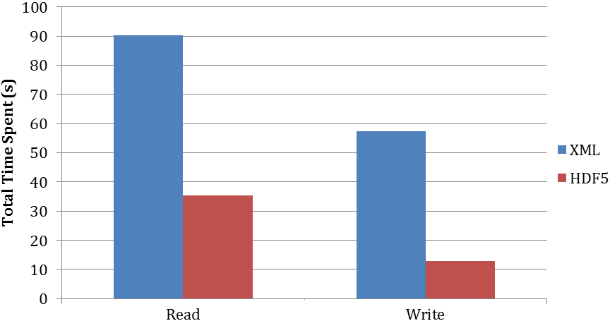 In this case, read times attain a speed up factor of approximately 3 with the new HDF5 approach while writes reach close to 5 times faster. This opens the door to solving problems which have been bottlenecked by the limited I/O bandwidth of a single process or by the overheads of having to communicate all data to that single rank.