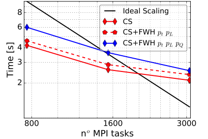 The main objective of the project was to retain the scalability of Code_Saturne after the inclusion of the new module. The figures below show the CPU time to solution per time step as a function of the number of processors. The scalability is presented for Code_Saturne without the module, Code_Saturne and the FWH module for surface sources (PL) only, and Code_Saturne for both surface and volume sources (PQ). An overhead of at most 10% of the CPU time is observed when adding the surface sources, while the inclusion of the quadrupole sources introduces an increase of up to 40% of the CPU time. However, the speed-up without and with the FWH module is very similar in all tests, demonstrating that scalability has not been affected by the addition of the new module.